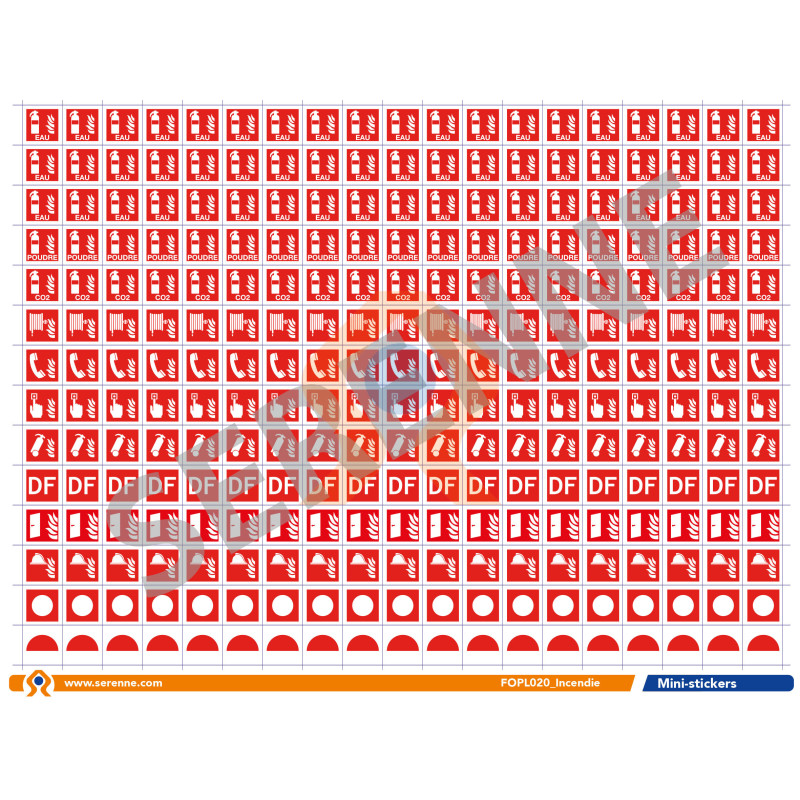 Planche de stickers pré-découpés avec les principaux symboles incendie à coller sur vos plans d'évacuation ou d'intervention, pratique rapide et économique.
